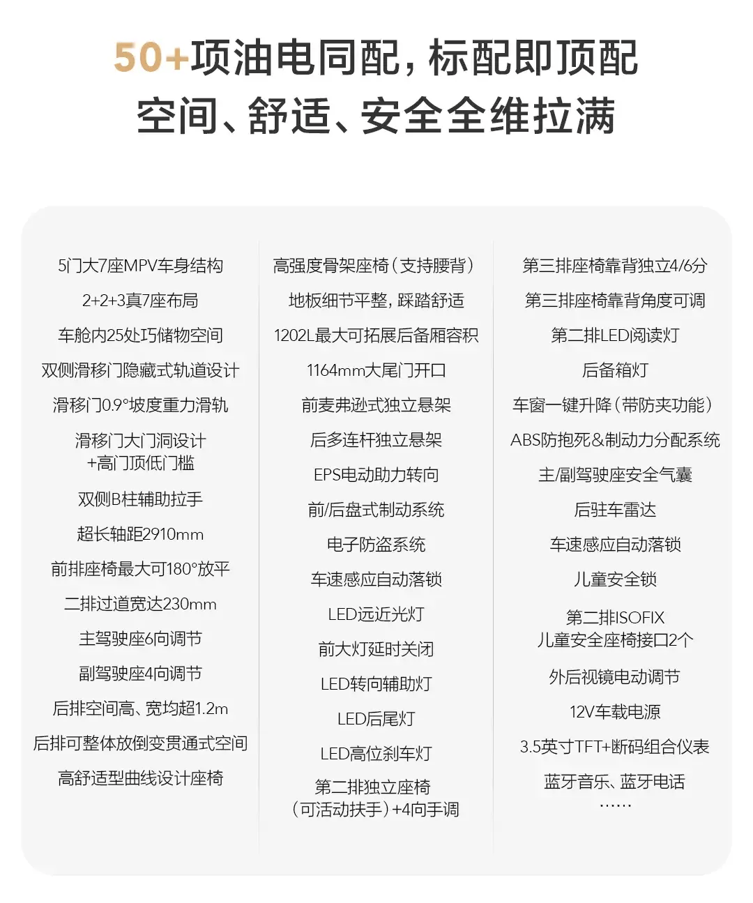 内饰设计以“简洁实用”为核心,提供胡桃棕与暖沙棕双色主题选择。座舱内搭载悬浮式仪表屏与12.8英寸中控屏,支持车机互联功能,并配备小憩、露营、离车不下电等场景模式,适应不同用车场景。座椅采用“2+2+3”七座布局,前排座椅支持180°大角度放平,二排座椅配备双侧扶手与多角度调节功能,三排座椅靠背最大调节角度达127°,且支持4/6分比例放倒。全车共设置25处储物空间,第三排座椅通过魔术翻折设计,可实现后备厢容积从315L扩展至1202L的灵活变换。二、三排共预留4个ISOFIX儿童座椅接口,兼顾家庭出行需求。